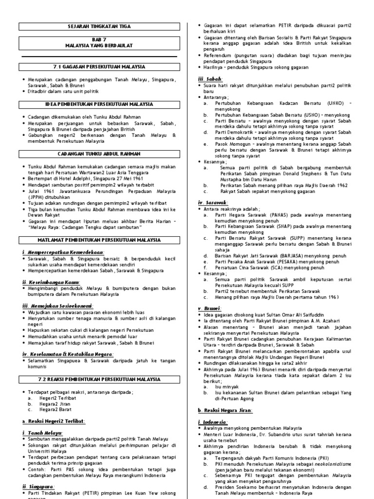 Kemenangan tersebut telah menggambarkan rakyat tanah melayu telah bersedia untuk merdeka. Pada 1963, persekutuan tanah melayu bergabung dengan singapura, sarawak dan sabah untuk membentuk persekutuan malaysia. Pengukuhan negara & bangsa malaysia6.1 cadangan pembentukan malaysiaaccess granted!pengenalan usaha membentuk persekutuan malaysia telah menimbulkan reaksi & cabaran dari dalam negeri & negara luar. Kemunculan negara berdaulat 31 ogos 1957. Pembetukan persekutuan malaysia pada tahun 1963 telah menyebabkan keadaan malaysia pada masa kini lebih stabil dari segi keadaan ekonomi dan sosialnya walaupun terdapat beberapa isu yang timbul pada masa sekarang. Lebih baik menyertai p.tanah melayu dari bab 9 jentera pentadbiran kerajaan persekutuan dan negeri di malaysia. Jawatankuasa antara kerajaan(jak) jak dibentuk untuk merangka perlembagaan persekutuan malaysia di samping melindungi hak serta kepentingan melalui penubuhan malaysia, penjajahan british di asia tenggara dapat dihapuskan. Pendidikan negara yang diasaskan kepada hasrat untuk menyatupadukan rakyat malaysia dan memberikan penekanan kepada usaha melahirkan insan. Wakil pbb meninjau sekali lagi pendapat rakyat sarawak dan sabah. Usaha ini seiring dengan ketetapan perhimpunan agung. (a) membentuk dan mewujudkan sebuah masyarakat islam yang dinamik dan progresif; Memudahkan usaha untuk menarik pemodal luar. Ketiga, perlembagaan persekutuan malaysia adalah berdasarkan perlembagaan persekutuan tanah melayu.